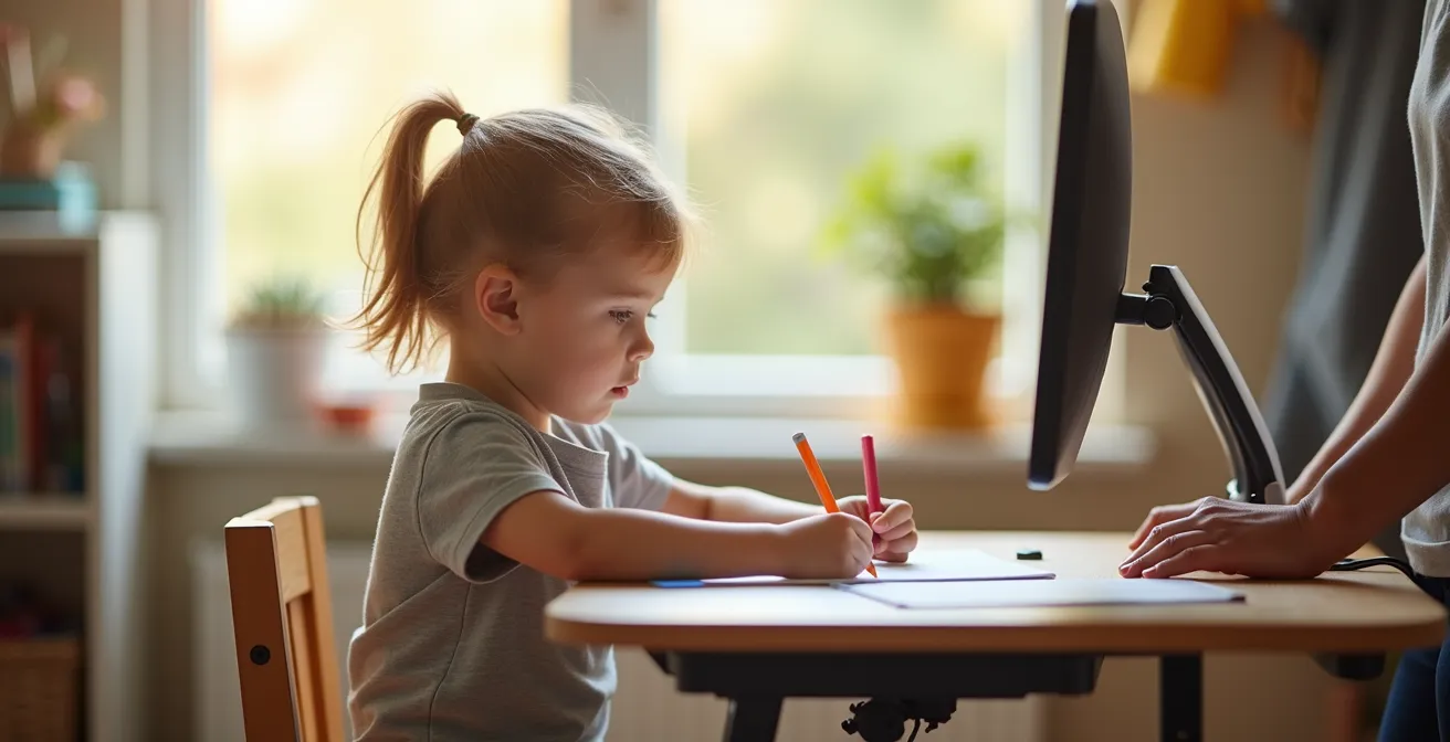 Die gängigen Ratschläge konzentrieren sich auf eine vage Vorstellung von „gutem Sitzen“. Doch das Problem ist weitaus ernster. Es geht nicht um Komfort, sondern um die aktive Prävention von Skoliosen, Rundrücken und chronischen Nackenverspannungen, deren Ursprung oft in den ersten Schuljahren liegt. Die eigentliche Frage, die Sie sich als verantwortungsbewusste Eltern stellen müssen, ist nicht, ob ein Schreibtisch schön ist, sondern ob er eine präventivmedizinische Funktion erfüllt. Die Antwort ist ernüchternd: Ein starrer, nicht anpassbarer Tisch ist aus medizinischer Sicht für ein wachsendes Kind ungeeignet und potenziell schädlich.